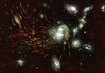Международная команда астрономов с помощью комплекса радиотелескопов ALMA обнаружила гигантские, светящиеся потоки ионизированного углерода, окутывающие три сталкивающиеся галактики в сердце протоскопления SPT2349-56. Это открытие, опубликованное в The…