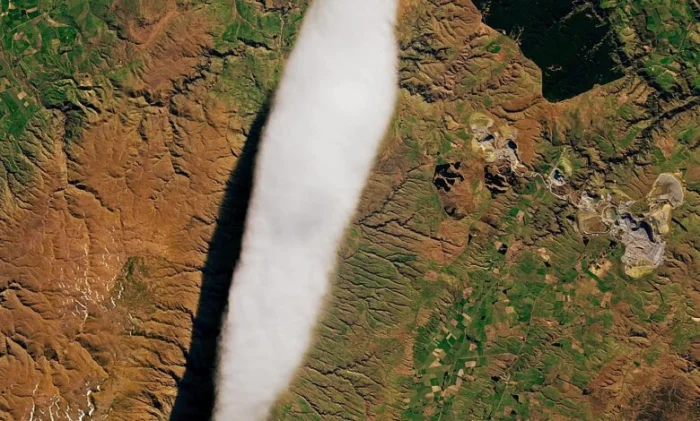 Спутник НАСА запечатлел необычное облако, проплывающее над регионом Отаго, расположенным у подножия гор на юго-востоке Новой Зеландии. Это увлекательное и интригующее метеорологическое явление вызвало любопытство с тех пор, как снимок был представлен общественности. Облако, получившее название «Питомец Тайери», впервые было замечено в 1890-х годах и неоднократно появлялось в одном и том же месте между Миддлмарчем и Хайдом. Хотя его силуэт напоминает НЛО, по мнению некоторых интернет-пользователей, это чисто природное явление.