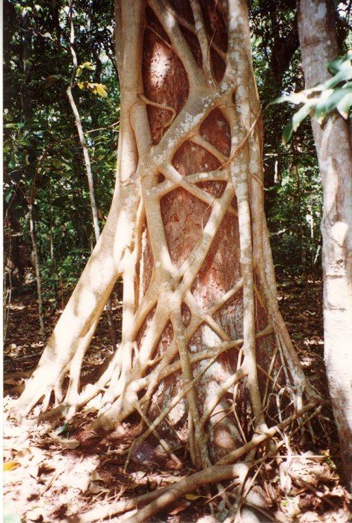 Лианы — большие, древесные лозы, которые цепляются за деревья, а многие из них свисают на землю. Они были прославлены в фильмах «Тарзана». Плоды едят птицы или обезьяны, и семена откладываются в их фекалиях на ветвях высоко в пологах. Семена прорастают, и стебель направляется вниз к земле. Как только стебель достигает земли, он формирует корневую систему; дополнительные стебли затем развиваются и растут вверх вдоль ствола дерева.