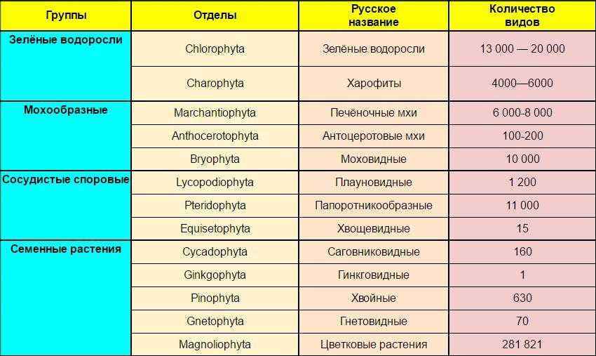 Растения распространены на суше, в океанах и в пресной воде. Они существовали на нашей планете миллионы лет. Количество видов ныне существующих зелёных растений представлено в следующей таблице: