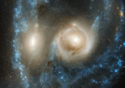 Призрачное лицо смотрит на нас сквозь 704 миллиона световых лет межзвездного пространства, что на самом деле является галактическим столкновением эпических размеров. С галактиками для глаз и кольцами газа и пыли на лице, система Arp-Madore представляет…