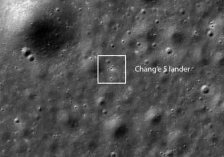 Изображение поверхности Луны, сделанное Lunar Reconnaissance Orbiter, опубликованное НАСА, показывает нам небольшую точку, которая на самом деле является китайским посадочным модулем Chang’e 5 через несколько часов после его приземления на наш…