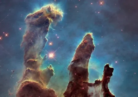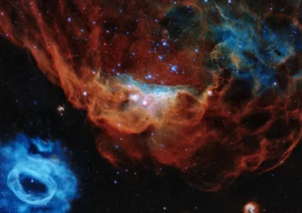 Космический телескоп Хаббл празднует свою 30 — ю годовщину запуска с выпуском потрясающе красочного портрета двух звездообразующих туманностей — коллективно прозванных «космический Риф» — расположенных в соседней галактике,…