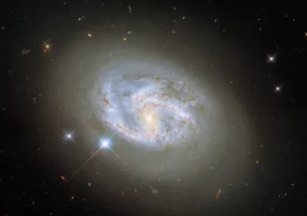 На снимке, полученном на прошлой неделе с космического телескопа «Хаббл», изображено не менее трех галактик: галактика NGC 4680 в центре снимка и две меньшие галактики в самом низу снимка и на крайнем правом углу. Галактика в центре, NGC 4680,…