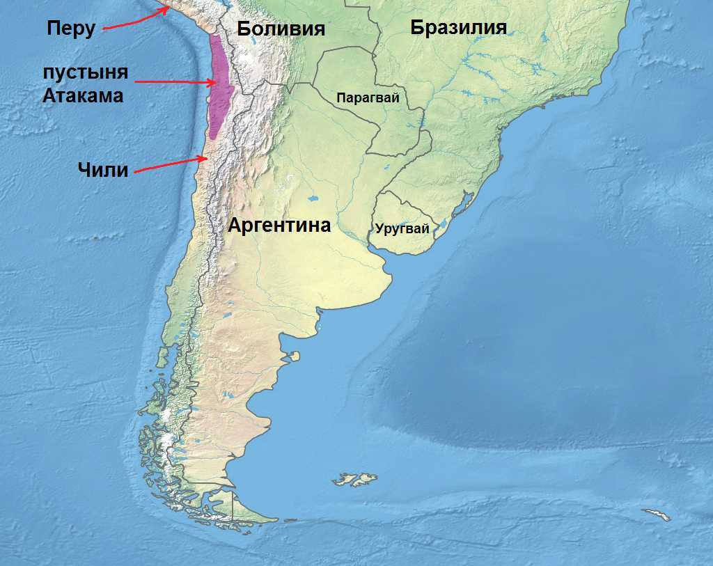 Пустыня Атакама расположилась на побережье западной части Южной Америки, прямо вдоль Тихого океана. Она протянулась почти на 1000 км от южной границы Перу на север Чили. Пустыня Атакама относится к одним из самых суровых регионов мира, так как получает только 1-15 мм осадков в год. В некоторых районах пустыни, дождя может не быть на протяжении многих лет, что делает невозможным присутствие любой растительной или животной жизни в этих местах. Относительно других пустынь, Атакама не очень жаркое место. Средняя летняя температура составляет 19 градусов по Цельсию. Главной отличительной особенностью этой пустыни, является практически нулевая влажность воздуха.