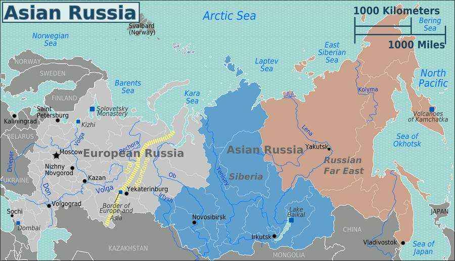 Россия охватывает около 17 млн. кв. км, и около 75 процентов территории станы находится в Азии. Хотя три четверти России расположены в Азии, более трех четвертей (около 110 млн. человек) населения проживает в европейских регионах страны. Сибирь является основным регионом в азиатской части России, занимающим около 77 процентов от общей площади РФ.