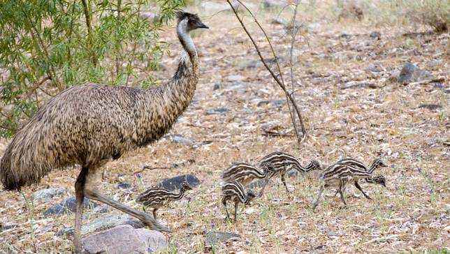 Как и тапиры, детеныши эму покрыты полосами и пятнами кремового оттенка. Когда они появляются на свет, внешне они почти не отличаются от своих гигантских родителей, но полосы и пятна на их оперении могут ввести вас в заблуждение. Становясь старше, эму теряют детское оперение и приобретают пыльно-коричневый окрас.