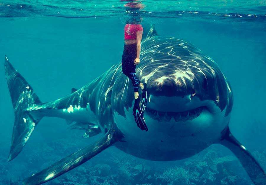 Знаменитая акула-людоед впечатляет своими размерами. В длину некоторые особи вырастают до 6 м, а вес самых отъевшихся экземпляров приближается к 2 т. Тело акулы по форме напоминает сигарету, серо-белый окрас помогает ей сливаться с окружающей средой. Обитает опасная хищница повсеместно, но предпочтение отдает водам в умеренных широтах. Для нее характерна способность поддерживать повышенную температуру тела, что помогает ей охотиться на быстрых и подвижных животных. Основу рациона составляют рыба, черепахи, птицы и мелкие морские млекопитающие.