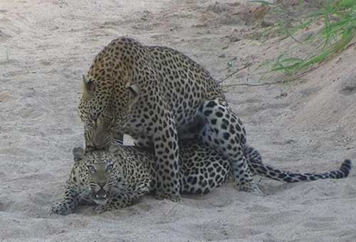 Леопарды ведут беспорядочную половую жизнь, поскольку самки и самцы имеют несколько партнеров. Самки привлекают потенциальных партнеров выделяющимися в их моче феромонами. Они, инициируют спаривание прогуливаясь перед самцом вперед и назад или хлопая его своим хвостом. Затем самец взбирается на самку, при этом часто кусает ее затылок. Спаривание длится в среднем три секунды с шестиминутным интервалом между каждым совокуплением. Одна пара может спариваться до 100 раз в день в течение нескольких дней. Размножение происходит круглый год, при этом пик припадает на сезон дождей в мае. В Китае и на юге Сибири, леопарды в основном размножаются в январе и феврале. Период течки у самки длится 7 дней, а цикл составляет 46 дней. Беременность продолжается 96 дней, самки рожают раз в 15-24 месяцев. Как правило, они прекращают размножаться в возрасте около 8-9 лет.