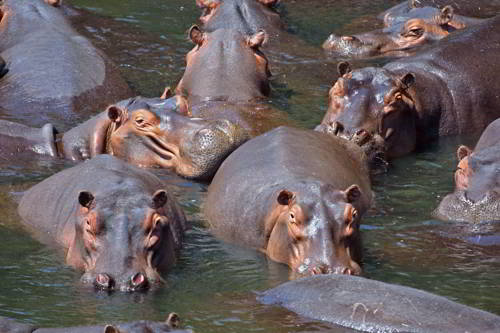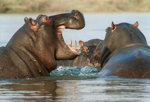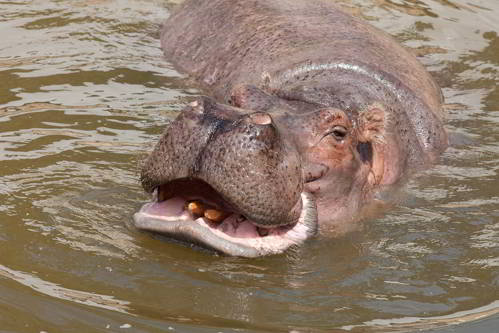 Громоздкие и бочкообразные, казалось бы, бегемоты неуклюжи на земле и в воде. Тем не менее, приспособленность к жизни в полуводной среде позволила им быстро передвигаться в воде и на суше. На земле, они способны развивать скорость до 30 км/час и поддерживать ее в течение нескольких сотен метров. На мелководье их короткие ноги обеспечивают мощное передвижение, а перепончатые лапы позволяют с легкостью перемещаться по дну рек. Расположение глаз, ушей, ноздрей высоко на голове позволяет гиппопотамам большую часть времени оставаться под водой, при этом легко дышать и контролировать обстановку вокруг себя. При полном погружении, бегемот закрывает ноздри и уши, чтобы предотвратить попадание воды в них. Челюсти способны открываться до 150 градусов, обнажая огромные, острые клыки и резцы. Клыки вырастают до 50 см, а резцы – до 40 см, затачиваются клыки друг об друга, во время пережевывания травы.