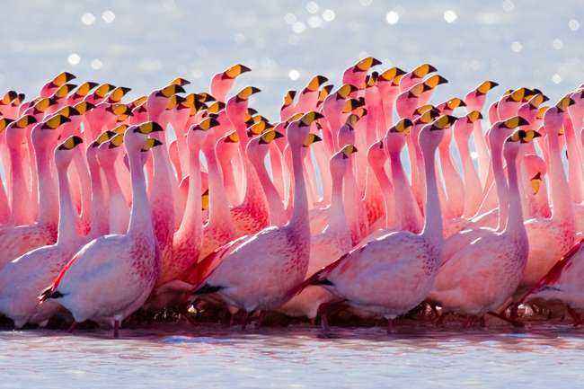 Фламингообразные (Phoenicopteriformes) — это древний отряд птиц, состоящий из шести видов из рода фламинго. Эти птицы с помощью своих специальных клювов извлекают из воды крошечные растения и животных. Фламинго — очень социальные птицы, образующие крупные колонии, состоящие из нескольких тысяч особей. Они синхронизируют спаривание и кладку яиц на сухой сезон, и когда уровень воды падает, фламинго строят свои гнезда на обнажившейся грязи. Их предпочтительные места обитания включают эстуарные лагуны, мангровые болота, крупные щелочные или соленые озера и др.