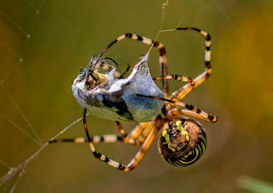 Еще одно интересное отличие паукообразных от насекомых заключается в процессе питания. Для наглядности, сравним наиболее похожих по многим показателям бразильского бананового паука и крупного богомола Heterochaeta orientalis. Эти два хищника примерно одного размера, если учитывать размах лап паука. Их длина составляет около 15-16 см. Также они имеют одинаковые пищевые предпочтения. Их меню содержит насекомых, ящериц, лягушек и мелких грызунов. И даже способы охоты у них практически идентичны. Они оба поджидают потенциальную жертву в засаде, а потом резко набрасываются на неё. Но расправляются они со своей добычей совершенно по-разному. Богомол, схватив жертву своими цепкими лапами, уже никуда её не выпустит, пока не съест всю целиком. Банановый паук же действует иначе. Он впивается ядовитыми хелицерами в тело своего трофея. Жертва от этого укуса либо мгновенно погибает, либо на какое-то время просто становится обездвиженной. Затем паук опутывает ее паутиной и впрыскивает желудочный сок, который растворяет внутренности добычи. Ест паук не спеша, его трапеза может растянуться на несколько суток. Таким образом, получается, что еда переваривается прямо в коконе. А все потому, что из-за особенностей ротового аппарата пауки просто не способны пережевывать пищу.