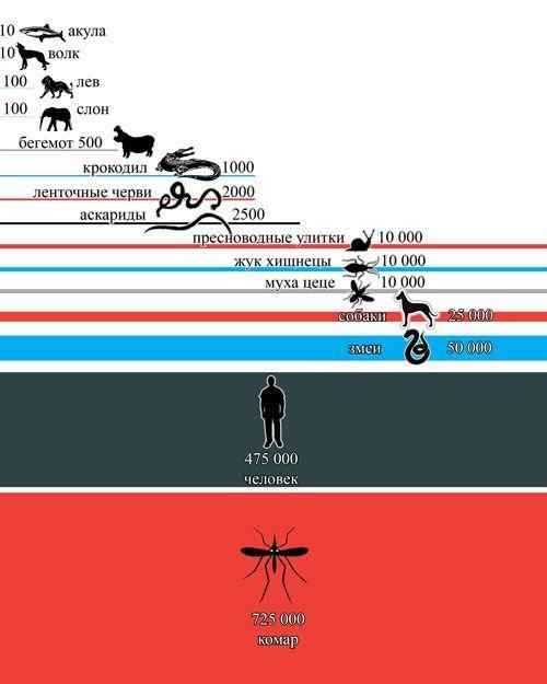 Удивительно, но самым опасным животным для человека является не большой хищник с острыми зубами, а скорее крошечное, жужжащее насекомое. Комары несут ответственность за около 725 000 смертей в год. Большинство людей считают их не чем иным, как летней вечерней неприятностью, но они являются самыми смертоносными животными на Земле. Болезни, которые переносят комары включают: малярию, лихорадку Денге, вирус лихорадки Западного Нила, желтую лихорадку и вирус Зика. Все эти заболевания вызывают широко распространенные страдания и смерть.