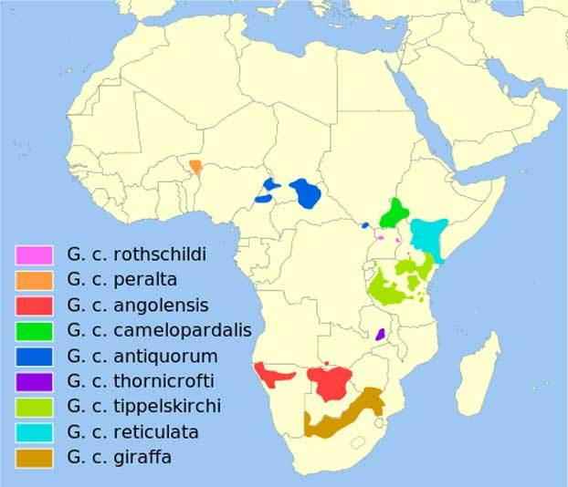 Распределение по подвидам включает территориальное расположение этих млекопитающих и рисунок на теле. На сегодняшний день выделяется девять подвидов жирафов: