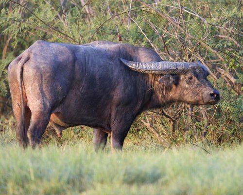 Азиатский буйвол появился на территории Австралии в XIX веке и распространился по северной части материка. Это крупные животные, которые предпочитают обитать около водоемов, где вода стоячая или с медленным течением. Это травоядные животные, водные растения составляют до 70% их рациона. Рога у самцов больше чем у самок и имеют длину до 2 м. Буйволы могут достигать около 2 метров в холке, 3 метров в длину и массы 1200 кг. Эти введенные животные так хорошо приспособились к австралийской среде обитания, что они причиняют значительный ущерб местной экосистеме. Продолжительность жизни азиатского буйвола составляет около 25 лет.