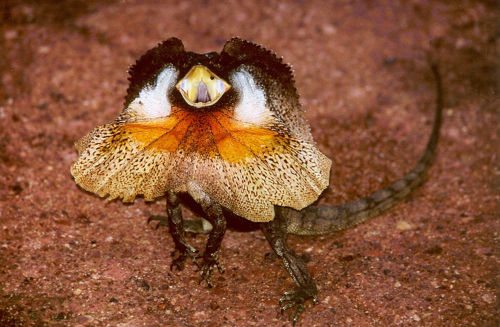 Плащеносная ящерица, живет в северной части Австралии. У нее есть заметная кожная складка вокруг шеи, напоминающая воротник. Когда она напугана, то становится на задние конечности и широко открывает рот, при этом ее воротник похож на раскрытый зонт. Если подобная защита не пугает атакующего, ящерица поворачивает хвост и убегает на большой скорости. Хотя она и безобидна, но может укусить, если для этого есть причина.